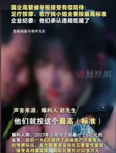 今天,网络上突然出现了一则新闻,一条热搜新闻,而且是一个国企高管代表团的新闻!据说,在我们浙江省,有一个公司,一个人接待了一个国企高管代表团,一笔6亿元的生意。按理来说:组织现在有规定,禁止饮食,更别提修脚、KTV、付费陪护了。按理来说,正确的做法是先开个商务会议,然后回顾一下工作,最后吃个便饭走人。但是,但是,他们吃、喝、玩,甚至把乐趣提升到了一个新的高度。他们不仅去足底按摩,还去KTV寻找跪倒在脚下的k女,并要求付费陪同。此外,他们还想喝茅台、吃高档食品、住五星级豪华套房。他们来了六次,花费了五十万多元。其中一位高管是还暗示要支付一大笔人情费,但他们拒绝了。最终项目失败了,于是该男子在网上爆料了这一消息。回顾这件事,爆料的赵先生对这些事情记忆犹新。经过六次接待,赵先生和公司的接待人员已经在思考这些国有企业高管的愿望。到了之后,工作就得暂时放下,吃喝玩乐都得提前安排好。赵先生等接待人员不敢松口。毕竟这是一笔6亿元的生意。直到那时他们在这个项目中失败了,他们的公司蓬勃发展。他们对国有企业高管考察组的到来表示热烈欢迎。大家都很紧张,生怕自己的工作出现一些差错。事实证明这是一场虚惊。国有企业高管考察组抵达。他们没有立即查看公司的工作能力,而是想先休息一下。时间嘿,要求住个好地方,赵先生和其他接待人员按照他们的要求安排了五星级豪华套房。这时候,在没有国企高管提示的情况下,赵先生和接待人员已经知道如何安排这些高管吃饭了。有了好菜,就少不了好酒、好烟。包括这些,他们喝的酒都会中毒。浓郁的酒香似乎抑制住了他们的食欲。吃喝住都解决了,还没有闲着,想继续放松;然后足疗、KTV、付费陪护就齐了。上述检查结束后,这些国有企业高管共来访6次。每当他们吃喝娱乐时,他们都必须达到最高标准。 6次招待,赵先生的公司花费超过50万元。花了很多钱之后,赵总公司的人都觉得这个项目很扎实,直到其中一位徐先生给出了暗示,要求赵先生的公司支付高额费用。这个福利费其实是赵先生的公司承担不起的,所以他也没有办法拒绝。没想到,就因为这一次拒绝,就浪费了五十万多元,他们的项目也破产了。此后,赵先生的爆料开始出现在网上。针对赵先生的爆料,国有企业高管也承认存在违规饮食等问题。纪委相关工作人员表示,如果存在谋取私利、暗中操作等问题,还需进一步调查。那么,您如何看待国有企业高管违规违纪的行为和现象?我个人有四点意见!首先,我个人对这件事感到有些惊讶,但也有些不高兴。这是非常令人惊讶的。一般来说,它应该被认为是正常操作的升级版本。现在,获取重要客户、大客户,似乎都是遵循这套方法。比如:住豪华酒店,吃一顿可口的饭菜,饭后一般都会安排“下半场”服务——足底按摩、找美女等,你觉得这样的操作正常还是不正常?我个人的看法是:上网肯定是违法的,但私下里却经常发生。这或许就是我们这个社会的共同特征之一吧!其次,本次活动有两个非常重要的信息!首先,胡吃海鼎、足疗KTV的考察组是一家国有企业,其身份与一般的民营企业不同。它是系统内的一个单位。二、揭露国企督察组拿钱不干事的主要原因;甚至还存在私人贿赂的问题。我认为以上两条信息可以得出一个结论:此事的性质发生了变化,已经从单纯的边界性商业交易转变为违法违纪行为。第三,现在组织严肃查处无意识饮食问题,就连餐厅就餐也要严格按照标准进行。然而这些人居然逆风作案,甚至不顾组织规定进行“下半身活动”。我认为应该认真、认真地对待他们。第四个投资者是的,为什么很多国企倒闭,为什么很多国企破产?其实主要原因是:权责不够明确、责任不够明确、善恶不分。由于公司不属于我,与我的利益无关如果我赚得更多或更少,那么我当然只是一天一天地赚更多的钱。最后我想说,很多东西既然存在,就有其存在的基础,所以最重要的是解决更深层次的问题。